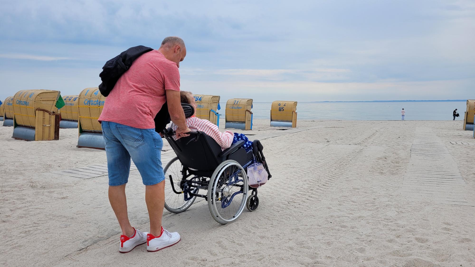 Zuerst stand ein ausgiebiger Spaziergang an der Strandpromenade auf dem Programm. Hier wurden alte Geschichten genauso wie der neueste Klönschnack ausgetauscht. Eines der Highlights für unseren Fahrgast war hier mit Sicherheit der freie Blick aufs Wasser, ebenso wie den eigenen Enkelkindern beim Rutschen auf dem Spielplatz zuzuschauen. Im Laufe der Zeit wuchs unsere Gruppe immer weiter, denn noch weitere Freunde schlossen sich Frau W. und ihren Begleitern an.