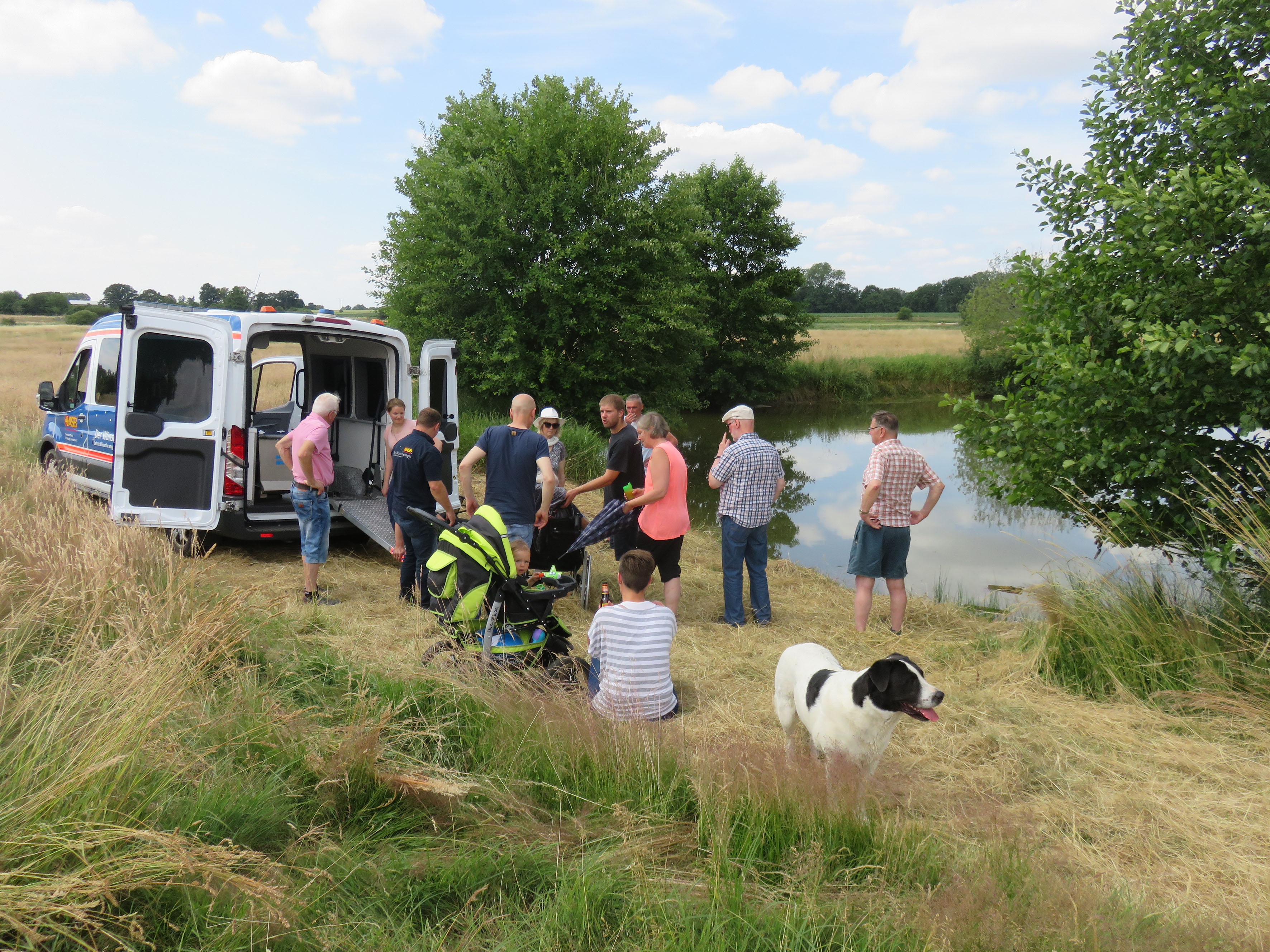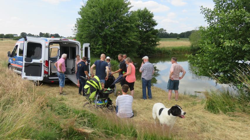 Dann wollte Herr P. noch einmal den See auf seinem 74 Hektar großen Grund einen Besuch abstatten. Sein Sohn hatte extra einen Weg in die Wiese gemäht, damit der Wünschewagen direkt ans Wasser fahren konnte. Nicht ganz leicht mit so einem großen Wagen, eine abschüssige Strecke zu befahren, aber zum Glück waren ja Profis am Steuer!