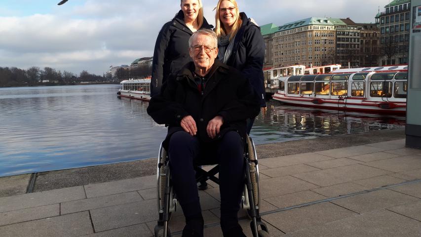 „Obwohl wir ein wenig zu früh vor Ort waren, war Herr S. schon bereit zur Abfahrt. Das Pflegepersonal erzählte uns, wie sehr er sich schon auf den Tag freute. Nach einem kurzen Telefonat mit der Tochter machten wir uns mit unserem Fahrgast auf den Weg nach Hamburg, wo wir freundlicherweise direkt bei der ATG an der Alster parken durften. Vor Ort erwarteten uns schon die Tochter sowie zwei seiner Enkelkinder, mit denen es dann im Rollstuhl und zugedeckt mit der Kuscheldecke auf die andere Straßenseite zum Restaurant Blockhouse ging. Dort wollte Herr S. gerne nochmal ein leckeres Steak essen. Wir waren ein wenig zu zeitig vor Ort, so dass wir noch ein paar Minuten an der kalten Luft, aber dafür mit Sonnenschein warten mussten.