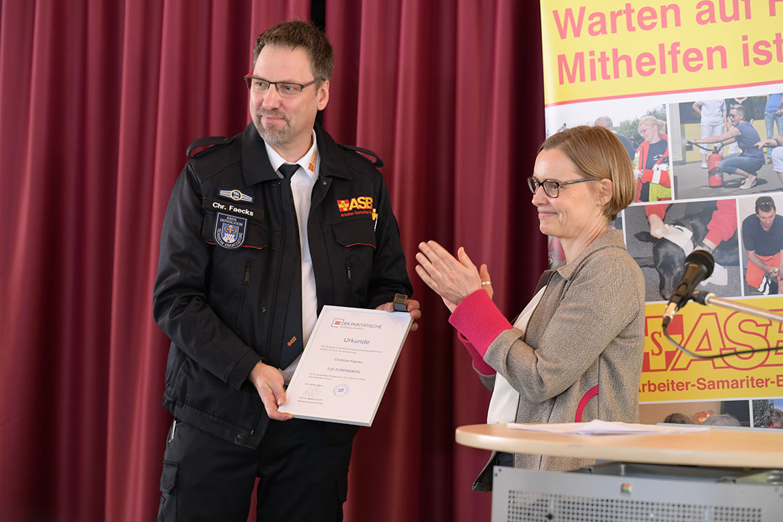 Eine besondere und überraschende Ehrung konnte der scheidende stellvertretende Vorsitzende des ASB Ostholstein Christian Faecks im Rahmen der diesjährigen Mitgliederversammlung am 9. März entgegennehmen. Die Verbandsratsvorsitzende des Paritätischen Schleswig-Holstein, Prof. Dr. Melanie Groß, zeichnete Christian Faecks für seine langjährigen ehrenamtlichen Verdienste beim ASB mit der Ehrennadel des Paritätischen aus.