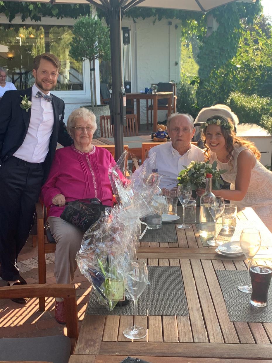 Die ganze Familie hat sich wirklich gefreut, die Hochzeit auch mit den Großeltern feiern zu können und haben unsere Ehrenamtlichen auch beim Transport mit dem Rollstuhl und der Trage tatkräftig unterstützt. Unsere Fahrgäste haben sichtlich die Hochzeit an dem schönen Bistensee genossen und waren auch noch beim Empfang nach der Trauung dabei zum Anstoßen.